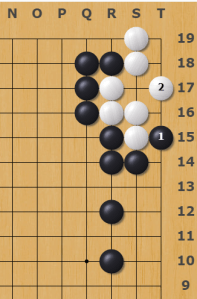 If your opponent does answer, then their move is called gote, and you get to retain sente for another turn. If you look at Diagrams 1 and 2 you can see how T15 (1) is a strong sente move for Black. If White does not answer, then Black will play at T17 (2) and kill the White corner.